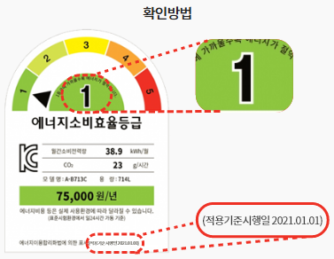 - 에너지효율등급 라벨에서 모델명, 등급, 적용기준 시행일 확인.